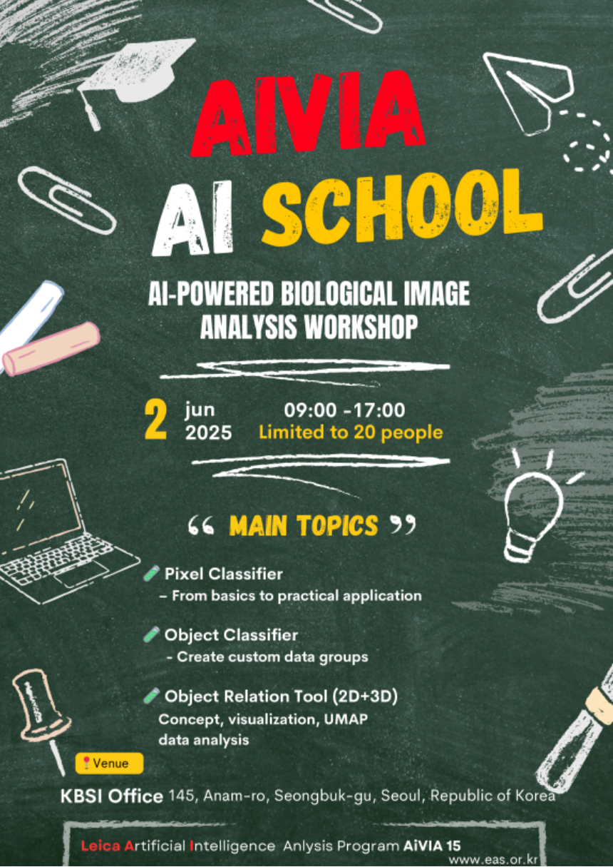 당사가 국내 판매 및 교육을 전담하고 있는 Leica의 첨단 AI 소프트웨어 ‘AiVIA’를 활발히 사용 중인 한국기초과학지원연구원(KBSI, https://www.kbsi.re.kr)과의 협력 일환으로, ‘제1회 AiVIA Ai School’을 개최합니다.
